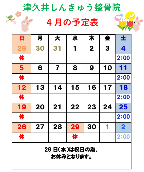 4月の施術日程のお知らせ 2026 3/30 お知らせ 2026年3月30日 4月29日(水)は、祝日のためお休みとさせていただきます。 津久井しんきゅう整骨院 お知らせ 花粉症に鍼灸は効果があるのか?足立区綾瀬津久井しんきゅう整骨院 関連記事 花粉症に鍼灸は効果があるのか?足立区綾瀬津久井しんきゅう整骨院 2026年2月27日 3月施術日程のお知らせ 2026年2月27日 2月施術日程のお知らせ 2026年1月24日 1月施術日程のお知らせ 2025年12月29日 夏季特別 頭部冷却キャンペーン 2025年7月23日 酸素カプセルキャンペーンのお知らせ 2024年6月24日 睡眠に不可欠な寝具、何を使っていますか? 2024年3月21日 大手口コミサイト「エキテン」でおすすめ整骨院1番に選ばれました! 2024年2月29日
